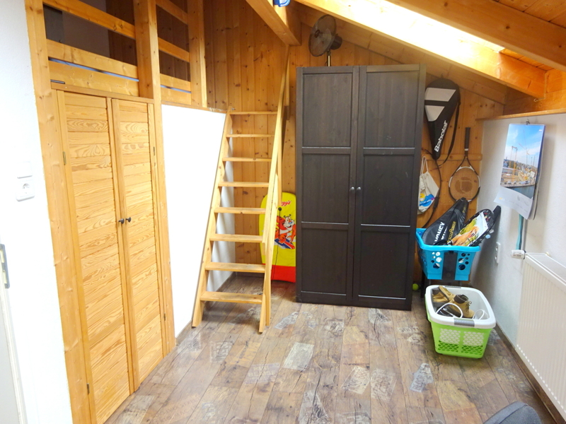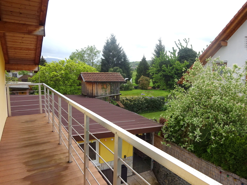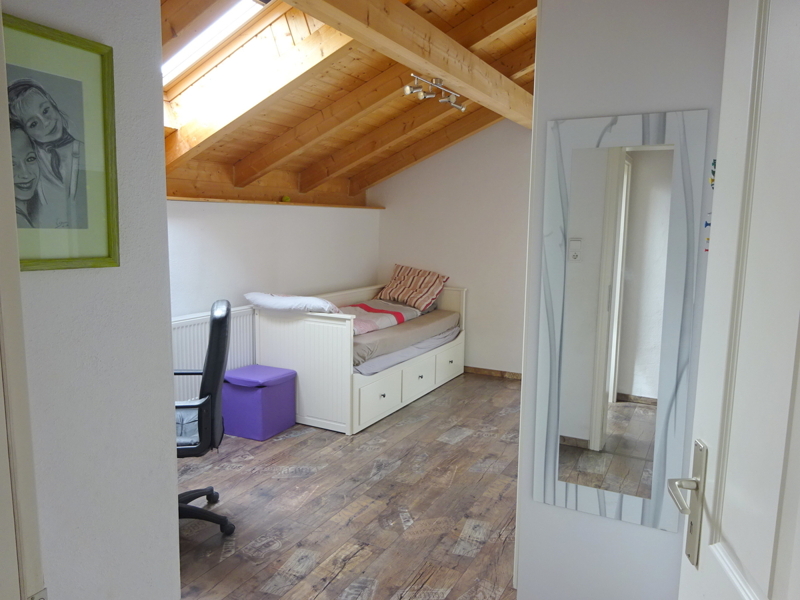 Im Obergeschoss erwarten Sie drei Schlafzimmer, eines mit begehbarem Kleiderschrank und eines mit eingebautem Hochbett. Von zwei der Zimmer gelangen Sie auf den Balkon mit schöner Aussicht ins Grüne.