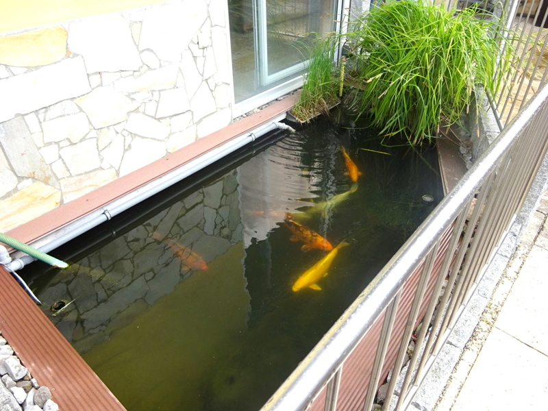 großes Wohnzimmer mit Zugang zur Terrasse mit Koiteich