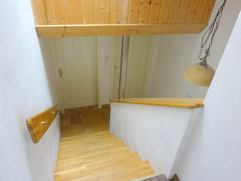Auf der Zwischenebene befindet sich das Tageslichtbad mit Dusche und Badewanne sowie ein Durchgang zur Erdgeschosswohnung im Vorderhaus. Dieser könnte auch geschlossen werden.