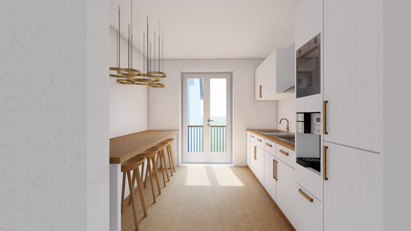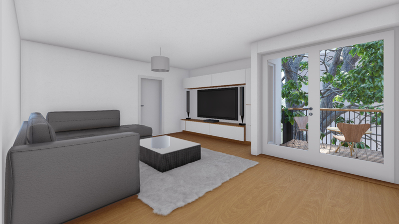 Die angebotene Wohnung entsteht im 1. Obergeschoss und teilt sich wie folgt auf: Ein großzügiges offenes Wohn-Esszimmer mit angrenzender Küche und 2 Balkonen, ein Schlafzimmer mit eigenem Tageslicht-Duschbad, zwei Kinder- oder Arbeitszimmer sowie ein helles Tageslichtbad mit Dusche, Badewanne und WC. Im Flur befindet sich noch eine kleine Abstellkammer.