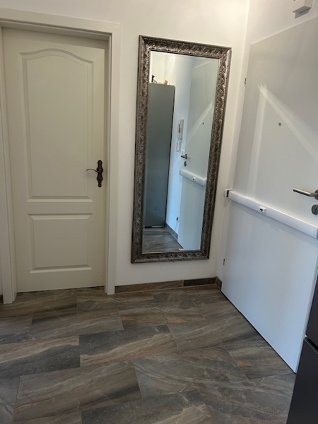Von der Diele gelangen Sie links zuerst in die helle Küche, danach ins Schlafzimmer. Rechts davon befindet sich das Badezimmer. Danach betritt man das Wohnzimmer, welches durch den Ausblick ins Grüne besticht.