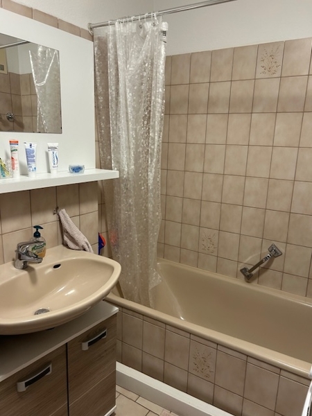 Das Bad verfügt über eine Badewanne, WC und einen Waschtisch.