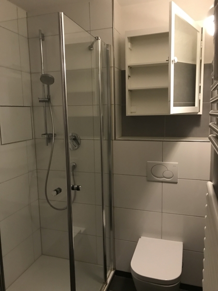 Es wurden neue Heizkörper, neue Elektroleitungen, Einbau eines Holzboden mit Parkett, Einbau eines neuen Bades mit Dusche und verändertem WC-Standort.