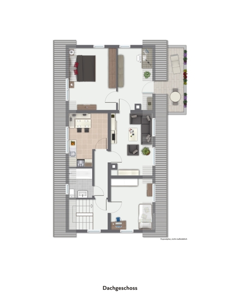 Im Dachgeschoss ( die Wohnung ist frei) erwartet Sie eine ca. 75 Quadratmeter große Wohnung mit ebenfalls 4 Zimmern, jedoch einer anderen Aufteilung. Die Wohnung verfügt über ein Wohnzimmer, ein Wohnküche mit Essplatz, ein Tageslichtbad, 2 Schlafzimmer (eines mit Zugang über das Treppenhaus - kann aber mit der Wohnung verbunden werden) und ein Durchgangszimmer das sich gut als Arbeitszimmer eignet, mit Zugang zum großen sonnigen Balkon.