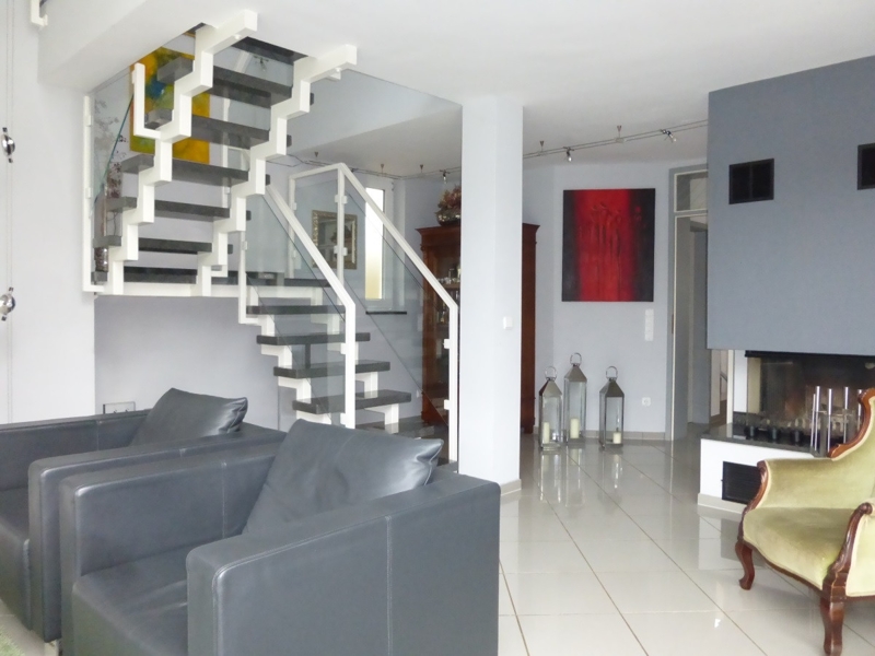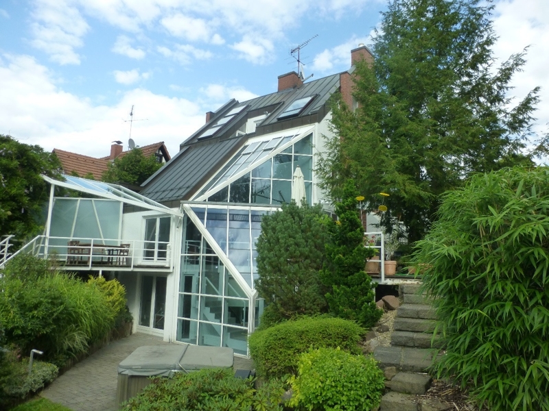 Dieses extravagante Haus wurde im Jahre 1993 auf einem ca. 3048m² großen Grundstück in massiver Bauweise errichtet. Auf ca. 300 m² Wohnfläche wird hochwertiges und komfortables Wohnen geboten. Das äußerst interessante Anwesen besticht durch seine Großzügigkeit in Verbindung mit viel Glas, hier sorgen bodentiefe Fenster für viel Licht und Helligkeit. Im Erdgeschoss des Hauses befindet sich der großzügige Wohn- und Essbereich, die Küche und Gäste WC. Hier genießen Sie den direkten Zugang zur Terrasse - großflächige Glaselemente und Glas-Türen ermöglichen Ihnen den Blick in den großzügigen Terrassenbereich mit Whirlpool und in die mit Teich und mehreren Terrassen angelegte Parklandschaft. Im Obergeschoss empfängt Sie eine wunderschöne offene lichtdurchflutete Galerie, sowie 2 Kinderzimmer, ein Bad und ein Ankleideraum. Im Dachgeschoss befindet sich das Elternschlafzimmer, ein Ankleidezimmer mit diversen Einbauschränken und ein großes Luxusbad mit Whirlpool, sowie die Dachterrasse. Im Untergeschoss stehen Ihnen neben einem Büro noch ein Gästezimmer, sowie Fitnessbereich, Sauna, Dusche, WC und Kellerräume zur Verfügung. Eine Garage komplettiert dieses interessante Angebot.
