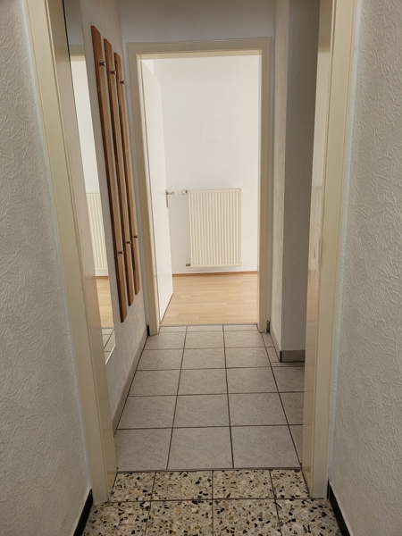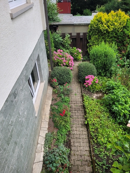 Zwei nebeneinanderliegende separate Haustüren befinden sich neben der Garage. Eine davon führt in die Einliegerwohnung. Diese besteht aus einem großzügigen Wohn-Schlafraum mit unverbautem Gartenblick, einem begehbaren Schrankbereich, einer Küche mit Einbauküche sowie einem Badezimmer mit Dusche.