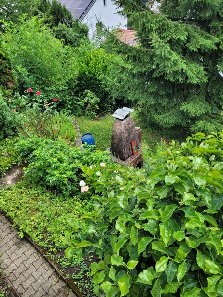 Ein Highlight ist der liebevoll gestaltete Garten. Er verfügt über mehrere terrassierte Ebenen. Auf der Ebene unterhalb der zweiten Terrasse wurde eine großzügige Grünfläche mit Gartenkamin angelegt.