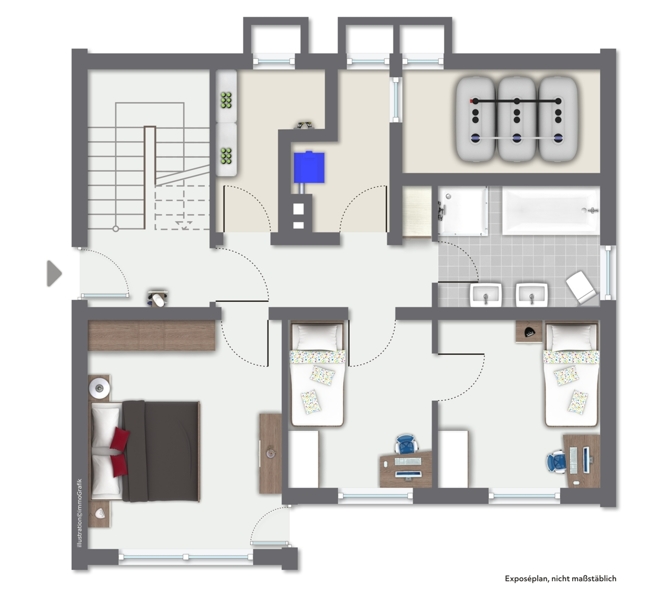 Das Dachgeschoss ist ebenfalls ausgebaut und bietet nochmal zwei Schlafzimmer zur Nutzung an oder es kann auch als Büro verwendet werden.