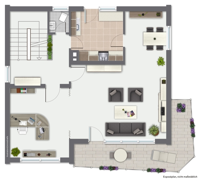 Im Erdgeschoss des Hauses befindet sich neben dem großen Wohn-Esszimmer mit Zugang zum Balkon die Küche sowie ein WC und der Hauseingang.