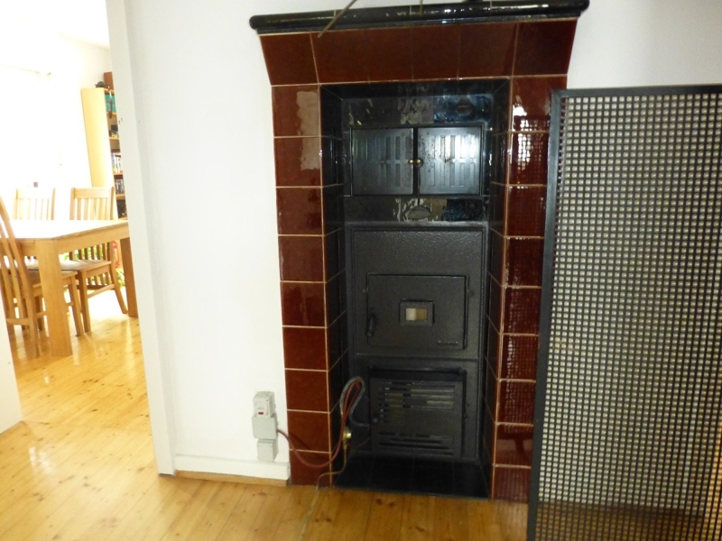 Heizung: Öl befeuerter Kachelofen mit Warmluftschächten
